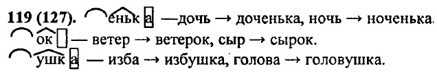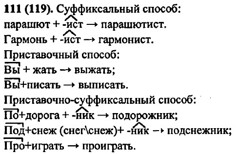 Упр. 112 (120). Сложение без соединительной гласной → соцпакет. Сложение с соединительной гласной → землетрясение. Сложение с одновременным присоединением суффикса → мясорубка. Упр. 113 (121). Тот, кто — игрок, ездок, стрелок. Уменьшительно-ласкательное значение — вечерок, бугорок, язычок, холодок, ледок, шнурок, уголок, сынок, сахарок, ветерок. Порог, рынок, хлопок, песок. Упр. 114 (122). Собака — собачка — собачонка. -к- — уменьшительно-ласкательный суффикс. -онк- — пренебрежительный. Упр. 115 (123). Запись показывает, как из слова добрый появилось слово добряк, а из слова добряк — слово добрячка. Так же рассматриваются слова гитаристка и водянистость. Упр. 116 (124).