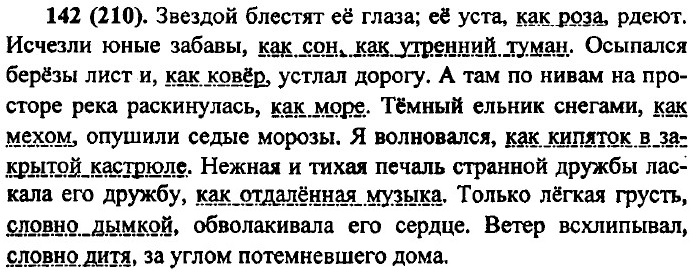 Упр. 143 (211). Её голос звенел, как колокольчик. А волосы у неё зелёные, как будто весенняя трава. Глаза у неё были тёмные, как ночь. На небе ярко сверкнула, словно драгоценный камень, первая звёздочка. Она была красива и свежа, как цветущий яблоневый сад. Внизу, будто сонная река, раскинулось поле пшеницы. Упр. 144 (212). Словно желтое око совы — сравнение.