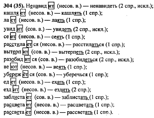 Упр. 303 (34). Глаголы совершенного вида отвечают на вопрос: что сделать? Глаголы несовершенного вида отвечают на вопрос: что делать? Например: нарисовать (что сделать?), рисовать (что делать?). Спряжение глагола с безударным личным окончанием определяется по неопределенной форме. Например: любить (на -ить, 2 спр.), бороться (на -оть, 1 спр.). Ко 2 спряжению относятся глаголы, оканчивающиеся в неопределенной форме на -ить, кроме брить, стелить, а также глаголы на -ать: гнать, дышать, слышать, держать; на -еть: ненавидеть, видеть, смотреть, терпеть, вертеть, обидеть, зависеть. Например: косить, строить, любить.