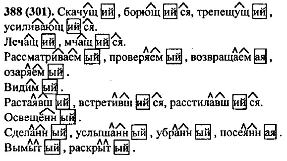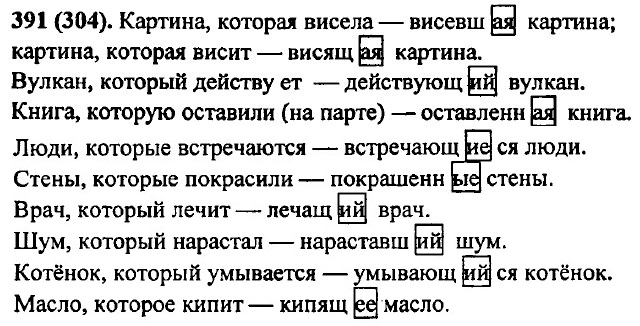 Упр. 389 (302). Прилагательные (в левом столбике) обозначают постоянные признаки предмета, а причастия (в правом столбике) выражают такие признаки, которые развиваются во времени. Упр. 390 (303).
