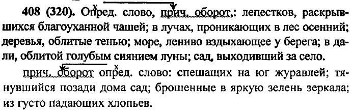 Причастие § 35. Причастный оборотУпр. 407 (319). Чуть слышится ручей, бегущий в сень дубравы, чуть дышит ветерок, уснувший на листах. Косой дождь, гонимый сильным ветром, лил как из ведра. Охотник устроился на большом камне, окружённом шумно плещущей, стремящейся по каменистому дну водой. Одинокий самолёт, плывущий на головокружительной высоте, кажется миноносцем, наблюдаемым со дна моря. Уже вечерело, солнце скрылось за небольшую осиновую рощу, лежавшую в полверсте от сада. Грянул гром — тучи дрогнули, охваченные синим огнём.
