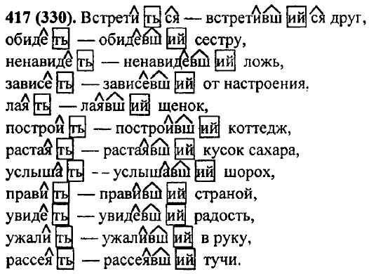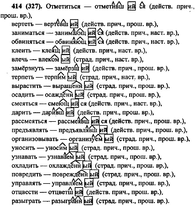 Причастие Образование причастий. Действительные и страдательные причастияУпр. 411 (324). Действительные причастия: ученик, выполняющий упражнение; ветер, колеблющий ветви деревьев; агроном, исследующий почву; ученики, любящие учителя. Страдательные причастия: упражнения, выполняемые учеником; ветви деревьев, колеблемые ветром; почва, исследуемая агрономом; учитель, любимый учениками. Упр. 412 (325) — устно. Упр. 413 (326) — устно.