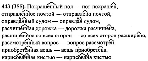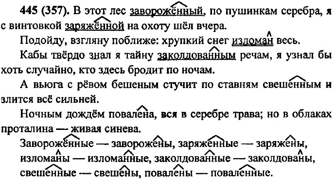 Упр. 444 (356). Получить — полученное — получено; заметить — замеченное — замечено; развинтить — развинченное — развинчено; прочувствовать — прочувствованное — прочувствовано; поразить — поражённое — поражено; застроить — застроенное — застроено; рассказать — рассказанное — рассказано; восстановить — восстановленное — восстановлено; взволновать — взволнованное — взволновано; разбудить — разбуженное — разбужено.