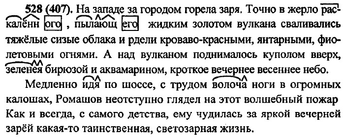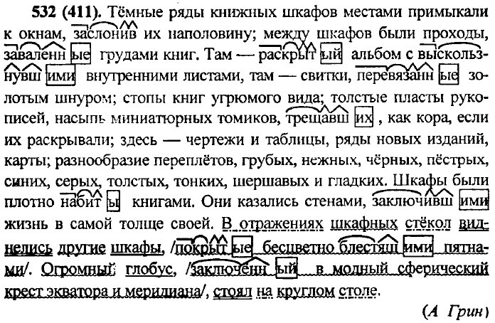 Упр. 529 (408). Закрыв книгу, мы надолго запомним её героев. Получив письмо из деревни, я сильно обеспокоился. Когда мы возвращались домой, пошёл дождь. Когда я пришёл в магазин, он оказался закрыт. Подплывая к берегу, я уронил в воду зонт. Упр. 530 (409) Лазурь небесная смеётся, ночной омытая грозой. Наклонившись над полыньёй, Анна Васильевна разглядела тянущуюся со дна тоненькую нитку. Не достигая поверхности воды, она лопалась мелкими пузырьками. Этот тонюсенький стебелёк с пузырьками был похож на ландыш. Надвигались зимние сумерки... всё было серо, тихо в деревушке, приютившейся около лощинки, среди снежных полей, слившихся с тёмным небом... слышались голоса баб, скликавших выпущенных овец. Привыкнув к ухаживавшим за ними людям, бобры не страшились выходить днём из построенных для них деревянных хаток. Речка девочкой невзрачной