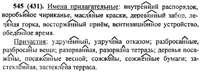 Упр. 544 (430). Н пишется в прилагательных, если они имеют суффиксы -ан-, -ян-, -ин-. (кожаный, глиняный, лебединый) НН пишется в прилагательных, если они имеют суффиксы - онн-, -енн- (миграционный, презренный) и если основа заканчивается на букву -н. (откровен-+н+ый= откровенный). В полной форме страдательных причастий пишется НН: заплетенная коса, отломанная ветка. В краткой форме страдательных причастий пишется Н: коса заплетена, ветка отломана.