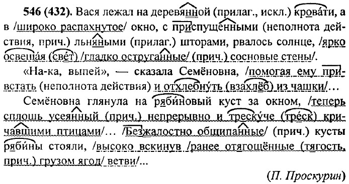 Причастные обороты: в широко распахнутое (окно), гладко оструганные (стеньг), теперь сплошь усеянный непрерывно и трескуче кричавшими птицами (куст), непрерывно и трескуче кричавшими (птицами), безжалостно общипанные (кусты), ранее отягощённые грузом ягод (ветви). Деепричастные обороты: ярко освещая гладко оструганные сосновые стены, помогая ему привстать и отхлебнуть из чашки, высоко вскинув ранее отягощённые грузом ягод ветви. Упр. 547 (433). Не с глаголами и деепричастиями обычно пишется отдельно, (не видел, не глядя). Не нельзя писать отдельно от глагола или деепричастия, если оно не употребляется без ке: (несдобровать, недоумевая) Упр. 548 (434). Не с причастиями пишется раздельно, если: а) при причастии есть пояснительные (зависимые) слова (не крашенный (кем?) отцом забор); б) это краткое причастие: работа не выполнена. Без этих условий не с причастиями пишется слитно. Например, некрашеный забор, невыполненная работа. Упр. 549 (435). Непотревоженная тишина леса зачаровывает и успокаивает. Прозрачный воздух, напоённый лесным ароматом, движется вверх. Птицы, не пуганные человеком, порхают, не обращая на нас внимания. Сказочная неправдоподобность происходящего волнует и удивляет, вызывая радостное недоумение. Мимо, не замечая нас и не спеша, движется лосиная семья. Кустики брусники были усыпаны ягодами, ещё не созревшими, зелёными. Не украшены красным цветом были и ветки рябины. Зачаровывает — очарование, очаровательный, чары, чародей, чарующий, очарованный, очаровать, очарованно. Успокаивает — спокойный, успокоение, успокоительный, спокойно. Аромат — ароматный, ароматизировать, ароматизированный. Порхают — порхание, вспорхнуть, упорхнуть, выпорхнуть. Волнует — волнение, взволновать, треволнение, волнующий, взволнованный, взволнованно, взволновать. Рябина — рябиновый, рябинушка, рябинолистный, рябинка, рябинный. Упр. 550 (н). — устно.