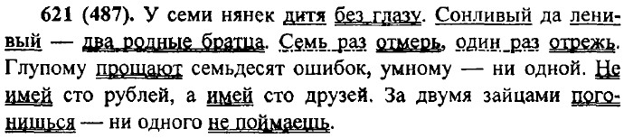 Упр. 618 (484). Стричь под одну гребёнку — уравнивать кого-либо с кем-либо; остаться в одной рубашке — в крайней нужде оказаться; звезда первой величины — известный, прославившийся в какой- либо области; играть первую скрипку — быть главным в каком- либо деле; всыпать по первое число — наказать по всей строгости; из третьих рук — узнать, получить что-либо через посредников; гнать в три шеи — выгонять грубо, с бранью и побоями; пятое колесо в телеге — лишний, ненужный в каком-либо деле человек; семи пядей во лбу — очень мудрый, умный, выдающийся; за семь вёрст киселя хлебать — далеко и попусту идти, ехать; быть на седьмом небе — испытать чувство восторга; работать до седьмого пота—до крайнего утомления, до изнеможения. Упр. 619 (485). На один зуб — очень мало; одна нога здесь, другая там — очень быстро, молниеносно; одного поля ягода — один другого стоит, один другого не лучше; семь пятниц на неделе — о том, кто часто меняет свои решения; семь потов сошло — очень усердно работал; наговорить с три короба — очень, чрезвычайно много; из первых рук — непосредственно от кого-либо, опять двадцать пять — выражение недовольства по поводу чего-нибудь повторяющегося и надоевшего; на своих двоих — пешком; как свои пять пальцев — знать очень хорошо; как две капли воды — совершенно, очень сильно похожи. Упр. 620 (н). — устно.