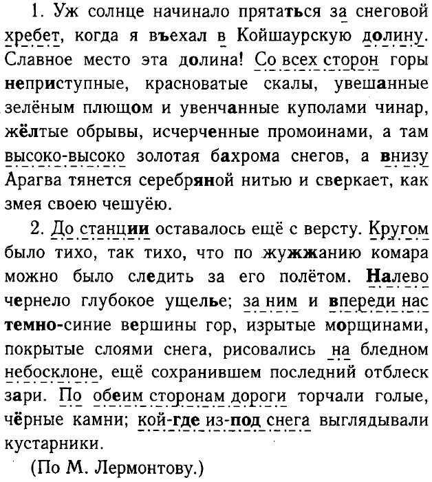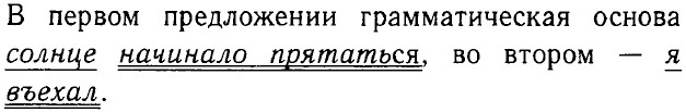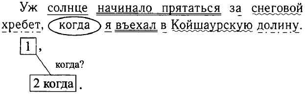 3. Связь между предложениями союзная. 4. Средство связи — подчинительный союз когда. 5. Отношение — второе предложение уточняет время действия в первом. 6. Уж солнце начинало прятаться за снеговой хребет. 1) повествовательное; 2) невосклицательное; 3) грамм, основа — солнце начинало прятаться, двусоставное; 4) распространённое, неосложнённое; 5) члены предложения: а) подлежащее — солнце, сущ., неодуш., 2-е скл., ср. р., ед. ч., им. п.; б) сказуемое — начинало прятаться, состав, глаг.; начинало (глаг., невозврат., изъяв, накл., прош. вр., ед. ч.); прятаться (глаг., возврат., изъяв, накл., н.ф.); в) обстоятельство — за хребет, сущ. с предл., неодуш., 2-е скл., м. р., ед. ч., р. п.; г) определение — снеговой, прил., относит., м. р., ед. ч., р. п. 7. Когда я въехал в Койшаурскую долину. 1) повествовательное; 2) невосклицательное; 3) грамм, основа — я въехал, двусоставное; 4) распространённое, неосложнённое; 5) члены предложения: а) подлежащее — я, мест., личное, 1-е л., ед. ч., им. п.; 6) сказуемое — въехал, глаг., невозврат., изъяв, накл., прош. вр., ед. ч.; в) обстоятельство — в долину, сущ., неодуш., 1-е скл., ж. р., ед. ч., п. п.; г) определение — Койшаурскую, прил., относит., ж. р., ед. ч., п. п. Упр. 145 — самостоятельно. Упр. 146 — самостоятельно. Упр. 147 — самостоятельно. Упр. 148 Однажды я был на рыбной ловле. С утра дул ветер, и небо хмурилось, но в полдень погода улучшилась. К вечеру на реке стихло. Рыба хорошо клевала весь день. Сперва попадалась плотва, окуни и ерши. В течение дня я не раз переходил с места на место, но крупной рыбы мне так и не удалось поймать. Вечером я вернулся домой с кучей мелкой рыбёшки. Упр. 149 — самостоятельно. Упр. 150 — самостоятельно. Упр. 151 — самостоятельно.