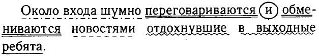 4. Простое, двусоставное, распространённое, осложнено однородными членами. 5. Члены предложения: а) подлежащее — ребята, сущ., одуш., мн. ч., им. п.; б) сказуемое — переговариваются (глаг., возврат., изъяв, накл., наст, вр., мн. ч.); обмениваются (глаг., возврат., изъяв, накл., наст, вр., мн. ч.); в) обстоятельства — около входа (сущ. с предлогом, неодуш., м. р., ед. ч., р. п.); шумно (нареч., неизм.); г) дополнение — новостями, сущ., 3-е скл., неодуш., ж. р., мн. ч., т. п. д) определение — отдохнувшие в выходные прич. об. Упр. 181