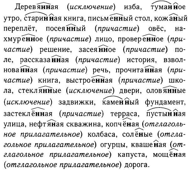 В таблице отсутствуют следующие случаи написания нн в полных прилагательных: слова-исключения (стеклянный, оловянный, деревянный); на стыке морфем (одна н входит в корень, другая — в суффикс); написание н в отглагольных прилагательных, образованных от глаголов несовершенного вида. Упр. 22