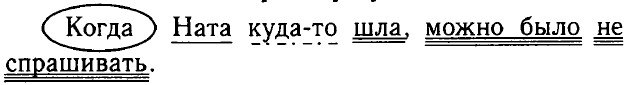 1. Повествовательное, невосклицательное, сложное. 2. Состоит из двух простых предложений. В первом грамматическая основа — Ната шла, во втором — можно было не спрашивать. 3. Связь между предложениями союзная. 4. Средство связи — подчинительный союз когда. 5. Отношения — условия. 6. Ната шла. 1) повествовательное; 2) невосклицательное; 3) основа — Ната шла, двусоставное; 4) нераспространённое, неосложнённое; 5) члены предложения: а) подлежащее — Ната, сущ., одуш., собств., ж. р., 1-е скл., им. п., ед. ч.; 6) сказуемое — шла, глаг., изъяв, накл., прош. вр„ ж. р., ед. ч.; 7. Можно было не спрашивать. 1) повествовательное; 2) невосклицательное; 3) грамм, основа — можно было не спрашивать; 4) нераспространённое, неосложнённое, односоставное; 5) главный член предложения — можно было не спрашивать; можно (частица), было (глаг., прош. вр., изъяв, накл.); не спрашивать (глаг., инф.).