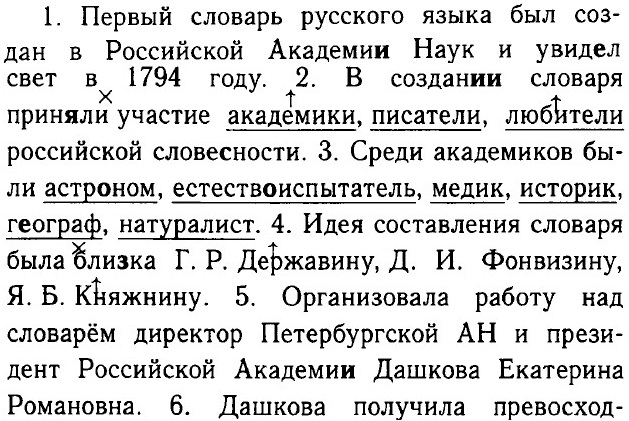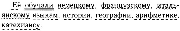 1. Повествовательное. 2. Невосклицательное. 3. Грамм, основа — обучали, односоставное. 4. Распространённое, осложнено однородными членами предложения (определениями и дополнениями). 5. Члены предложения: а) главный член предложения — обучали, глаг., неперех., невозврат., изъяв, накл., прош. вр., мн. ч. б) дополнения — её (мест., личн., ж. р., ед. ч., 3-е л.); языкам (сущ., неодуш., нариц., м. р., 2-е скл., т. п., мн. ч.); истории (сущ., неодуш., нариц., ж. р., 1-е скл., т. п., ед. ч.); географии (сущ., неодуш., нариц., ж. р., 1-е скл., т. п., ед. ч.); арифметике (сущ., неодуш., нариц., ж. р., 1-е скл., т. п., ед. ч.); катехизису (сущ., неодуш., нариц., 2-е скл., м. р., т. п., ед. ч). в) определения — немецкому (прил., относит., т. п., ед. ч.); французскому (прил., относит., т. п., ед. ч.); итальянскому (прил., относит., т. п., ед. ч). Упр. 236 Сколько однородных членов может быть в предложении? Очевидно, столько, сколько предметов, признаков, явлений и т. п. объединено в класс, группу по сходству или различию. Например, в «Обратном словаре русского языка» среди 125 тысяч слов содержится 56332 имени существительного. Допустим, мы бы начали предложение так: «Именами существительными являются...», а затем стали бы перечислять все 56332 существительных. Теоретически предложение с таким количеством однородных членов возможно. Практически же количество однородных членов в речи колеблется от двух до девяти. Это определяется особенностью человеческой памяти. Объём кратковременной памяти характеризуется ограниченным временем хранения информации (до 30 секунд) и ограниченным количеством удерживаемых элементов (7 ±2). Отсюда и ограничение в речи количества однородных членов. Другое дело — долговременная память, объём информации и длительность хранения в которой не ограничены. Основная мысль текста. Теоретически можно использовать любое количество однородных членов, однако это невозможно по причине ограниченной памяти человека. Синтаксический разбор предложения