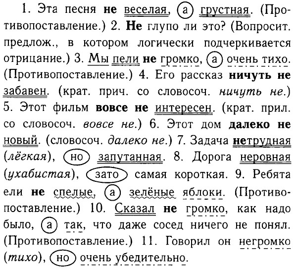 Повторение изученного в 5—7 классах Слитное и раздельное написание не с разными частями речиУпр. 28 Слова, употребляющиеся только с отрицательной частицей не: 1. Глаголы: не был, не имела, не делаются. 2. Краткие причастия: не прочитана, не испорчен, не рассказано. 3. Деепричастия: не глядя, не умея, не приходя. 4. Прилагательные относительные и притяжательные: не мамин, не каменный, не автомобильный, не семейный. 5. Числительные: не три, не пятый, не одиннадцатый. Упр. 29 1. Не годы, а горе старит. (Противопоставление с союзом а.) 2. Старый конь мимо не ступит. (Не с глаголом.) 3. Старость не радость. (Не служит для выражения отрицания.) 4. Ученье — свет, а неученье (синоним — безграмотность) — тьма. 5. Всякая неправда (синоним — ложь) — грех. 6. Не работа, а забота сушит. (Противопоставление с союзом а) 7. От непорядка (синоним — беспорядок) и сильная рать погибает. Упр. 30