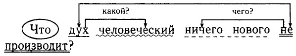 1. Вопросительное. 2. Невосклицательное. 3. Грамм, основа — дух не производит, двусостав. 4. Распространённое, неосложнённое. 5. Члены предложения: а) подлежащее — дух, сущ., неодуш., нариц., 2-е скл, м. р., им. п., ед. ч.; б) сказуемое — не производит, глаг., изъяв, накл., наст, вр., ед. ч., 3-е л.; в) определение — человеческий, прил., относит., им. п., ед. ч., м. р. г) дополнение — ничего (мест., отриц., ед. ч.) нового (прил., кач., ед. ч., р. п.). Упр. 45 Основная мысль текста раскрывается в предложении: Нет, не станем на него клеветать: разум неистощим в соображении понятий, как язык неистощим в соединении слов. Автор опровергает распространенное мнение о том, что всё уже написано и сказано, и новые книги будут повторением созданных ранее. Пушкин доказывает свою мысль с помощью следующего аргумента: ... разум неистощим в соображении понятий, как язык неистощим в соединении слов. Все слова находятся в лексиконе; но книги, поминутно появляющиеся, не суть повторение лексикона. Упр. 46 Стихотворение Ф. И. Тютчева, состоящее из одного предложения, является. текстом, потому что в нем выражена законченная мысль, все части текста-предложения связаны между собой. Тема обозначена в первой части текста: Умом Россию не понять. В последующих двух частях, тема развивается: Аршином общим не измерить, У ней особенная стать. В последней части текста следует вывод: В Россию можно только верить. Упр. 47 В этом тексте сравниваются Пушкин и митрополит Филарет Московский как писатели. Оба они, как отмечает автор, обладали даром слова. Главным их различием является то, что митрополит Филарет Московский свой талант отдал Церкви, и каждая его речь была голосом церковной совести, а Пушкин служил, по мнению автора, Истине. Основная мысль данного текста заключается в том, что великие писатели и мыслители, такие как А. С. Пушкин и митрополит Филарет, подают всем своим читателям пример, как необходимо выражать свои мысли на бумаге, а именно кратко, ясно, без лишних слов. Тогда каждое слово приобретает особое значение, становится голосом совести. Первая и последняя фразы в тексте связаны. В первом предложении выражена основная мысль текста, это тезис, который автор развивает на протяжении всего текста. Последнее предложение почти повторяет по смыслу первое. Но это уже вывод, к которому автор привел читателя после серии доказательств и примеров, иллюстрирующих его мысль. Предложения в тексте связаны с помощью местоимений (он, это, его), лексического повтора (в одном предложении говорится о церковной совести, в следующем — о том, что ... личность митрополита Филарета была в такой мере поглощена Церковью).