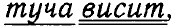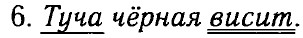 1) повествовательное; 2) невосклицательное; 3) грам. основа. — 4) распространённое, неосложнённое; 5) члены предложения: а) подлежащее — туча, сущ., ж. р., ед. ч., им. п., 1-е скл.; б) сказуемое — висит, глаг., изъяв, накл., ед. ч., невозврат., наст, вр., 3-е л.; в) определение — чёрная, прил., качеств., полн. ф., ед. ч., им. п., ж. р.