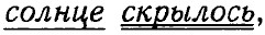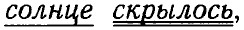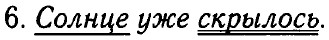 1) повествовательное; 2) невосклицательное; 3) грам. основа — 4) распространённое, неосложнённое; 5) члены предложения: а) подлежащее — солнце, сущ., ср. р., ед. ч., им. п., 2-е скл.; 6) сказуемое — скрылось, глаг., возврат., изъяв, накл., прош. вр., ед. ч., ср. р., 3-е скл.; в) обстоятельство — уже, нареч., неизм. часть речи.