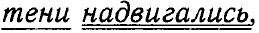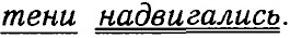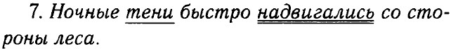 1) повествовательное; 2) невосклицательное; 3) грам. основа — 4) распространённое, неосложнённое; 5) члены предложения: а) подлежащее — тени, сущ., мн. ч., им. п., 3-е скл.; 6) сказуемое — надвигались, глаг., изъяв, накл., возврат., мн. ч., прош. вр.; в) определение — ночные, прил., относит., полная форма, мн. ч.; г) обстоятельство образа действия — быстро, нареч.; д) обстоятельство места — со стороны леса, словосочетание сущ. с предл. + сущ.