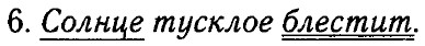 1) повествовательное; 2) невосклицательное; 3) грам. основа — 4) распространённое, неосложнённое; 5) члены предложения: а) подлежащее — солнце, сущ., ср. р., ед. ч., им. п., 2-е скл.; 6) сказуемое — блестит, глаг., изъяв, накл., невозврат., ед. ч., наст, вр., 3-е л.; в) определение — тусклое, прилаг., качеств., полн. ф., ед. ч., им. п., ср. р.