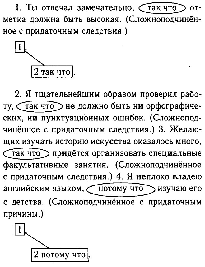 Основные группы сложноподчинённых предложений Сложноподчинённые предложения с придаточными причины, условия, уступки, цели, следствияУпр. 131 1. Придаточные предложения после главного. Я считаю Уланову своим учителем, потому что встречи с ней, с её искусством становились всегда для меня уроками творчества, мудрости, красоты. (Ю. Завадский.) В театре служат, а не работают, потому что театр — это храм. (М. Садовский.) 2. Придаточные предложения перед главным. Поскольку участок оказался сильно заболоченным, пришлось срочно приняться за осушение его. (А. Куприн.) Так как я умел петь народные песни, матросы охотно приняли меня в свою компанию. (Ф. Шаляпин.) Оттого что облака почти касались верхушек берёз, на земле было тихо и тепло. (К. Паустовский.) 3. Придаточное предложение в середине главного. Все возы, потому что на них лежали тюки с шерстью, казались очень высокими и пухлыми. (А. Чехов.) Поскольку участок оказался сильно заболоченным, пришлось срочно приняться за осушение его. (А. Куприн.) — Это предложение не входит ни в одну группу, так как нарушена традиционная зависимость придаточного от главного предложения: ключевое слово участок переместилось из главного в придаточное. Главное предложение без придаточного потеряет традиционный вид и смысловую завершённость. Упр. 132