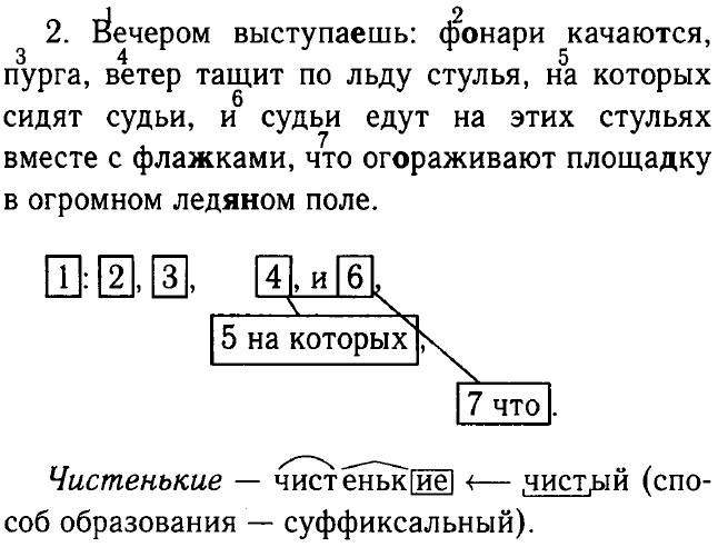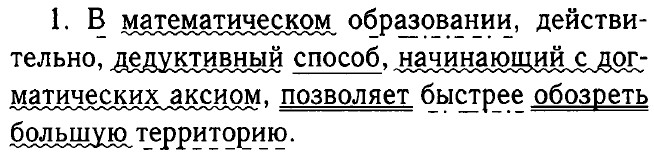 Упр. 213 — устно. Упр. 214 Аксиоматический — прилагательное от слова аксиома — положение, принимаемое без доказательств. Дезориентирует — вводит в заблуждение, лишает правильной ориентации, правильного представления о чём-либо. Интуиция — чутьё, проницательность; безотчётное проникновение в самую суть чего-либо. Дедуктивный — прилагательное от дедукция — способ рассуждения от общих положений к частным. Догматических — основанных на положениях, которые принимаются как непререкаемые; не допускающих возражений. Пресловутое — широко известное, нашумевшее, но сомнительное или заслуживающее отрицательной оценки. Синтаксический разбор предложения