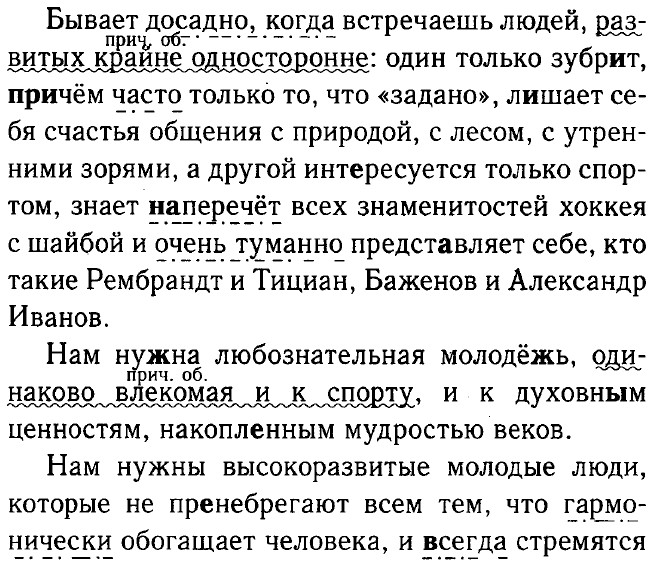 Упр. 247 Причастия: летевших, рябившими, по измятой, съеденная, разбухшие, разорванных, падающей, выдранные, летевшее, сверкающими, текущие, стоящей, провядшему. Прилагательные: талым, мокрый, чёрными (кач.), железной, тяжёлых (кач.), сырых (кач.), широкий (кач.), синими (кач.), навозная, лиловые (кач.), страшной (кач.), ослепительный (кач.), лазурный, острый (кач.), чистый (кач.), мягким (кач.), сильным (кач.), снеговых, вешние, синевато-прохладный (кач.), голубыми (кач.), огромное (кач.), серые (кач.), крупчатые, прошлогоднюю, снеговая, чистая (кач.), пахучая (кач.). Упр. 248 Гармоничный человек — человек будущего