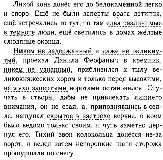 Устаревшие слова: споро, врата детинца, кремник, тын, хоромы, створы, застрех, вервие, неторопкие, привратник. Устаревшие слова важны для воссоздания ушедшей эпохи, о которой повествует писатель, многие из этих устаревших слов обозначают предметы, давно ушедшие из жизни людей, некоторые имеют архаичную форму, которая употреблялась в описываемое время действия. Белокаменной — соединительная о.