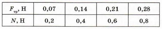 12. Скатившись с горки, санки движутся по горизонтальной поверхности. Зависимость координаты санок от времени при движении по горизонтальной поверхности выражается в единицах СИ формулой х = 20 + 5t - 0,25t2. а) Чему равна начальная скорость санок? б) Чему равен коэффициент трения между полозьями санок и снегом? 13. При исследовании зависимости силы трения скольжения Fтp от силы нормальной реакции N были получены данные, приведённые в таблице. Чему равен коэффициент трения скольжения?