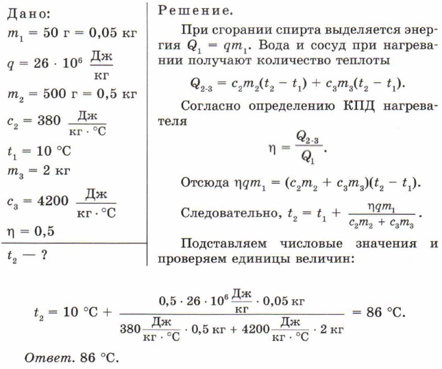 Пример решения задачи В медном сосуде массой 500 г нагревают воду массой 2 кг, взятую при температуре 10 °С. До какой температуры можно нагреть воду, сжигая 50 г спирта? КПД горелки считайте равным 50 %.