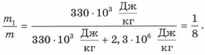Пример решения задачи В колбе находилась вода при температуре 0 °С. При откачке воздуха из колбы вода кипела и замерзала. Какая часть воды при этом превратилась в пар? Р е ш е н и е. Пусть m — масса всей воды до откачивания, а m1 — масса образовавшегося пара. Тогда масса образовавшегося льда равна m - m1. При кристаллизации воды выделяется количество теплоты, равное λ(m - m1). Для испарения воды требуется количество теплоты, равное Lm1. В соответствии с законом сохранения энергии λ(m - m1) = Lm1. Отсюда получаем Следовательно, При решении задачи мы не учитывали, что значения L при температуре 0 °С и 100 °С несколько различаются. О т в е т. В пар превратилась Устная разминка 7.1. Почему испарение жидкости происходит при любой температуре? 7.2. Почему при испарении температура жидкости понижается? 7.3. Почему испарение происходит тем быстрее, чем выше температура жидкости? 7.4. Зависит ли скорость испарения жидкости от площади ее поверхности? 7.5. Почему при наличии ветра жидкость испаряется быстрее? 7.6. Приходилось ли вам «ускорять» испарение? Приведите примеры. Как и для чего вы это делали? 7.7. Что обладает большей внутренней энергией: вода массой 1 кг при температуре 100 °С или водяной пар такой же массы при той же температуре? Обоснуйте свой ответ. 7.8. Почему температура воды, долго находившейся в открытом стакане, всегда несколько ниже температуры воздуха в комнате? 7.9. Какие явления природы объясняются конденсацией пара? Приведите примеры.