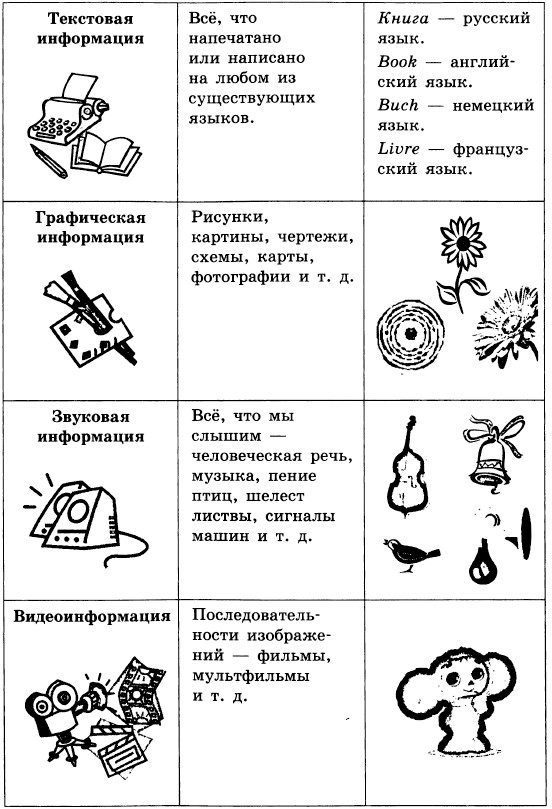 Для получения более точной информации в дополнение к органам чувств человек издавна использует различные устройства и приборы: линейку, транспортир, термометр, барометр, весы, компас, телескоп, микроскоп и так далее. Полученную информацию человек может представить в виде записей, изображений, звуков и так далее. Виды информации по форме представленияС давних времён люди стремились облегчить свой труд. Они придумали подъёмный кран, автомобиль, самолёт и множество других машин, механизмов и приспособлений, усиливающих их физические возможности. В XX веке были созданы компьютеры. Они облегчают умственный труд человека, усиливают его интеллектуальные способности, помогают справиться с гигантскими объёмами информации.