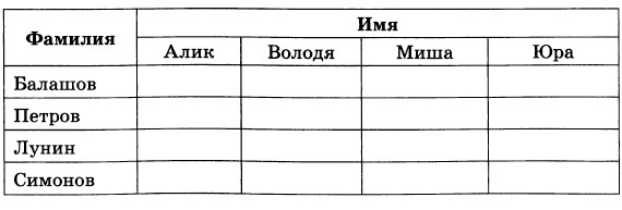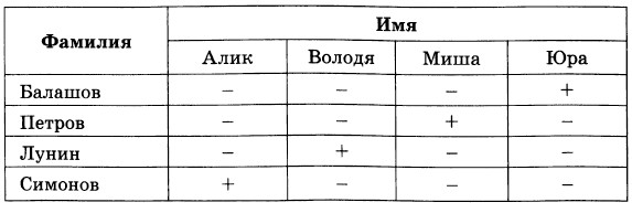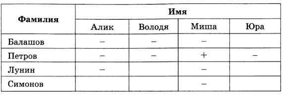Из первой строки таблицы следует, что фамилия Юры — Балашов (ставим плюс в соответствующей ячейке и минусы во всех свободных ячейках графы «Юра»). Из первой графы таблицы следует, что фамилия Алика — Симонов (ставим плюс в соответствующей ячейке и минусы во всех свободных ячейках строки «Симонов»). Единственная пустая ячейка на пересечении строки «Лунин» и графы «Володя» говорит о том, что фамилия Володи — Лунин: