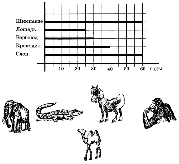 Для того чтобы показать, как устроены окружающие нас объекты (предметы, процессы, явления) и как они связаны друг с другом, используют схемы. Каждый ученик 5 класса знает схематичное изображение приставки, корня, суффикса и окончания слова. Поэтому вы сразу поймёте, о чём идёт речь, если учитель русского языка попросит подобрать слова, соответствующие следующей схеме: Для наглядного представления разных числовых данных используют диаграммы. Рассмотрим следующий пример. Средние продолжительности жизни слона, крокодила, верблюда, лошади и шимпанзе равны 60, 40, 30, 25 и 60 годам соответственно. Представим эти данные на линейной диаграмме. Возьмём для изображения одного года жизни отрезок длиной 1 миллиметр. С помощью линейки начертим 5 горизонтальных отрезков, длины которых будут равны 60, 40, 30, 25 и 60 миллиметрам соответственно: