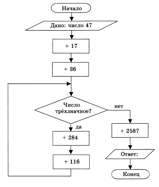 Решение Представим этот же процесс преобразования информации по шагам: 1) 47 + 17 = 64; 2) 64 + 36 = 100; 3) 100 — трёхзначное? (да); 4) 100 + 284 = 384; 5) 384 + 166 = 550; 6) 500 — трёхзначное? (да); 7) 550 + 284 = 834; 8) 834 + 166 = 1000; 9) 1000 — трёхзначное? (нет); 10) 1000 + 2587 = 3587. Самостоятельно выясните, каким будет результат вычислений, если исходное число уменьшить на 24.