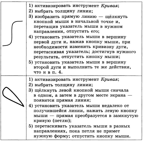 Инструмент выбирается левым щелчком на его кнопке. Перемещением курсора мыши его устанавливают в нужную точку рабочей области. Применяют инструмент протягиванием мыши при нажатой кнопке (левой или правой). Для закраски замкнутой области используют инструмент Заливка Если при работе с инструментами Карандаш, Кисть, Распылитель и Заливка вы нажимаете левую кнопку мыши, то изображение выполняется основным цветом. Если нажимаете правую кнопку — фоновым. Инструменты чертёжникаРисовать Карандашом и Кистью начинающему художнику трудно. В графическом редакторе есть несколько удобных инструментов для рисования простейших графических объектов: прямых и кривых линий, квадратов, прямоугольников, многоугольников, эллипсов и кругов. С помощью инструмента Линия С помощью инструмента Кривая