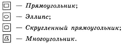 Прямоугольник, эллипс и скругленный прямоугольник строят так: 1) активизируют нужный инструмент; 2) помещают указатель мыши в ту часть экрана, где должна быть построена фигура; 3) нажимают левую кнопку мыши и перетаскивают указатель мыши по диагонали. Чтобы нарисовать квадрат и окружность, при использовании инструментов Прямоугольник и Эллипс следует удерживать нажатой клавишу Shift. С помощью инструмента Многоугольник можно изображать замкнутые ломаные линии причудливой формы. Делают это так: 1) активизируют инструмент Многоугольник; 2) изображают одно звено ломаной (устанавливают указатель в определённом месте рабочей области и перетаскивают его в нужном направлении), отпускают кнопку мыши; 3) поочередно выполняют щелчки в других вершинах ломаной — каждая следующая вершина соединяется отрезком с предыдущей; 4) в последней вершине выполняют двойной щелчок — последняя вершина соединяется с первой. Чтобы многоугольник содержал углы по 45° и 90°, при перемещении указателя следует удерживать нажатой клавишу Shift . Когда активизирован любой из инструментов Прямоугольник, Эллипс, Скругленный прямоугольник или Многоугольник, ниже панели инструментов появляются три возможных способа заполнения. Здесь показан эффект от применения каждого из них: