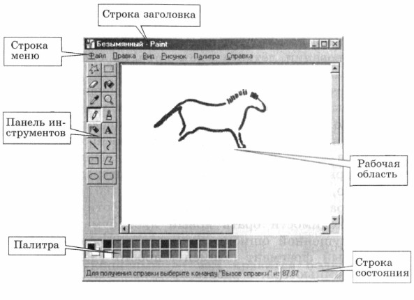 После запуска графического редактора Paint на экране компьютера открывается его окно, основные элементы которого показаны на рисунке.