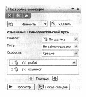 12. Задайте траекторию перемещения осьминога. 13. Для начала просмотра анимации воспользуйтесь функциональной клавишей F5 или соответствующими кнопками в области задач Настройка анимации. 14. Дождитесь завершения показа слайда и щелчком мышью вернитесь в рабочую область. 15. Изучите информацию в области задач Настройка анимации. Внесите изменения в параметры анимации. Понаблюдайте за изменениями в ходе просмотра.