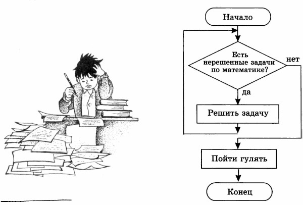 § 3.4. Типы алгоритмов Алгоритмы с повторениямиНа практике часто встречаются задачи, в которых одно или несколько действий бывает необходимо повторить несколько раз, пока соблюдается некоторое заранее установленное условие. Форма организации действий, при которой выполнение одной и той же последовательности действий повторяется, пока выполняется некоторое заранее установленное условие, называется циклом (повторением). Алгоритм, содержащий циклы, называется циклическим алгоритмом или алгоритмом с повторениями. Ситуация, при которой выполнение цикла никогда не заканчивается, называется зацикливанием. Следует разрабатывать алгоритмы, не допускающие таких ситуаций. Рассмотрим пример из математики. Натуральное число называют простым, если оно имеет только два делителя: единицу и само это число1. 1 Напомним, что число 1 не относят ни к составным (имеющим более двух делителей), ни к простым числам. 2, 3, 5, 7 — простые числа; 4, 6, 8 — нет. В III веке до нашей эры греческий математик Эратосфен предложил следующий алгоритм для нахождения всех простых чисел, меньших заданного числа n: 1) выписать все натуральные числа от 1 до n; 2) вычеркнуть 1; 3) подчеркнуть наименьшее из неотмеченных чисел; 4) вычеркнуть все числа, кратные подчеркнутому на предыдущем шаге; 5) если в списке имеются неотмеченные числа, то перейти к шагу 3, в противном случае все подчеркнутые числа — простые. Это циклический алгоритм. При его выполнении повторение шагов 3-5 происходит, пока в исходном списке остаются неотмеченные числа. Вот так выглядит блок-схема действий школьника, которому перед вечерней прогулкой следует выполнить домашнее задание по математике: