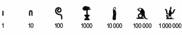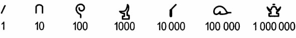 Глава 4. Материал для любознательных Обозначение чисел и счет в Древнем ЕгиптеПримерно в третьем тысячелетии до нашей эры египтяне придумали свою числовую систему, в которой для обозначения ключевых чисел 1, 10, 100 и так далее использовались специальные значки — иероглифы. Вот они: