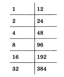Здесь в левом столбце записаны результаты удвоений единицы, а в правом — числа 24. Записи делались до тех пор, пока не оказывалось, что из чисел левого столбца можно составить множитель 15: 1 + 2 + 4 + 8 = 15. После этого складывались соответствующие числа правого столбца: 24 + 48 + 96 + + 192 = 360. При делении египтяне многократно удваивали в правом столбце делитель и, соответственно, в левом столбце — число 1, пока числа правого столбца оставались не большими делимого. Далее из чисел правого столбца пытались составить делимое, и если это удавалось, то сумма соответствующих чисел в левом столбце давала искомое частное. Если делимое не делилось нацело на делитель, то получали частное и остаток. Например, чтобы разделить 541 на 12, надо было составить таблицу: