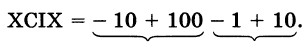 Для обозначения чисел 100, 500 и 1000 стали применять первые буквы соответствующих латинских слов (Centum — сто, Demimille — половина тысячи, Mille — тысяча). Чтобы записать число, римляне использовали не только сложение, но и вычитание ключевых чисел. При этом применялось следующее правило. Значение каждого меньшего знака, поставленного слева от большего, вычитается из значения большего знака. Например, запись IX обозначает число 9, а запись XI — число 11. Десятичное число 28 представляется следующим образом: XXVIII = 10 + 10 + 5 + 1 + 1 + 1. Десятичное число 99 имеет такое представление: