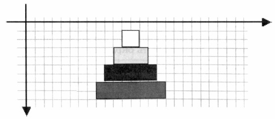 Все четыре закрашенных прямоугольника, образующих этот рисунок, будем строить последовательно, снизу вверх. 1. Запустите среду программирования QBasic. 2. Наберите команду, устанавливающую графический режим. 3. Наберите команду LINE (90, 70) — (170, 90), 4, bf; с ее помощью исполнитель LINE начертит на экране прямоугольник, закрашенный красным цветом, у которого (90,70) — координаты левой верхней, а (170,90) — правой нижней вершины. 4. Наберите команду LINE (100, 50) — (160,70), 8, bf; с ее помощью исполнитель LINE начертит на экране прямоугольник, закрашенный синим цветом. 5. Самостоятельно допишите команды, с помощью которых будут начерчены зеленый и желтый прямоугольники. 6. Отладьте набранную вами программу. 7. Сохраните свою программу под именем Пирамида. 8. При наличии свободного времени откройте программу Штанга1 и измените ее так, чтобы перекладина и диски штанги имели синий цвет. Сохраните новую программу под именем Штанга2 с помощью команды [Файл-Сохранить как...]. 9. Завершите работу со средой программирования QBasic. Задание 5 Задача: написать программу для исполнителя LINE, с помощью которой на экран компьютера будет выведен один из следующих рисунков (на экране компьютера части рисунков должны быть окрашены в разные цвета):