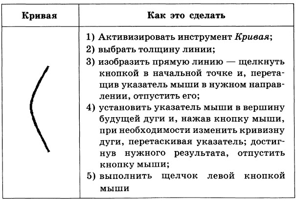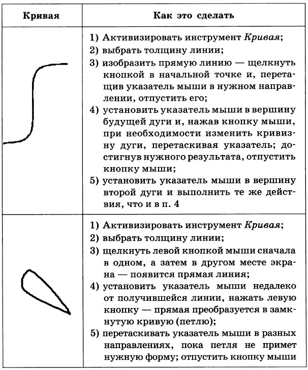 — Кривая. С помощью этого инструмента можно изображать кривые линии, состоящие из одной или двух дуг, а также замкнутую кривую (петлю).