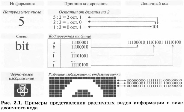 Современные компьютеры могут обрабатывать разные виды информации: числа, текст, изображения, звуки. Информация любого вида представляется в компьютере в виде двоичного кода — последовательностей нулей и единиц. Некоторые способы двоичного кодирования представлены на рис. 2.1.