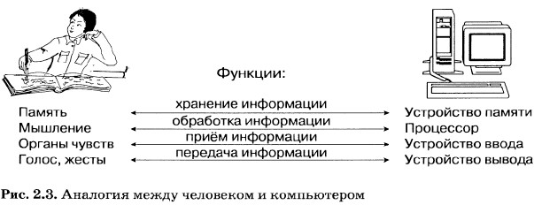 § 2.1. Основные компоненты компьютера и их функции Устройства компьютера и их функцииЛюбой компьютер состоит из процессора, памяти, устройств ввода и вывода информации. Функции, выполняемые этими устройствами, в некотором смысле подобны функциям мыслящего человека (рис. 2.3). Но даже столь очевидное сходство не позволяет нам отождествлять человека с машиной хотя бы потому, что человек управляет своими действиями сам, а работа компьютера подчинена заложенной в него программе.