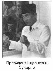 Индонезия освободилась от голландского колониального владычества в ходе войны, когда в 1945 году президентом был провозглашен лидер антиколониального движения Сукарно, который поклялся править на основе «национализма, гуманизма, демократии, благоденствия народа, веры в Бога». В 1959 году президент Сукарно распустил парламент, оппозиционные партии и объявил режим «направленной демократии». Сукарно жил в грандиозных дворцах, ему воздвигали памятники как «отцу нации», а в стране не хватало продуктов, воды, электричества. Когда в 1965 году против президента подняли восстание коммунисты, то подавившие его военные уничтожили около полумиллиона повстанцев вместе с членами их семей.