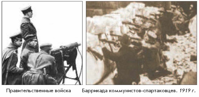 Совет народных уполномоченных отменил чрезвычайные законы, ввел восьмичасовой рабочий день, разрешил свободную деятельность профсоюзов, обязал предпринимателей заключать с профсоюзами коллективный договор. Судьбу страны должно было решить Учредительное собрание, выборы в которое были назначены на январь 1919 года. Социал-демократы рассчитывали установить в Германии демократическую парламентскую республику, развивать партнерство между предпринимателями и профсоюзами. Однако лидеры входившей в НСДПГ группы «Спартак» — Карл Либкнехт и Роза Люксембург — предлагали установить в Германии власть советов по российскому образцу, национализировать предприятия (передать из частной собственности в государственную). В декабре 1918 года спартаковцы вышли из НСДПГ и создали Коммунистическую партию Германии (КПГ). В январе 1919 года КПГ попыталась захватить власть в Берлине и ряде других городов, но восстание было подавлено войсками, а лидеры КПГ Карл Либкнехт и Роза Люксембург казнены.