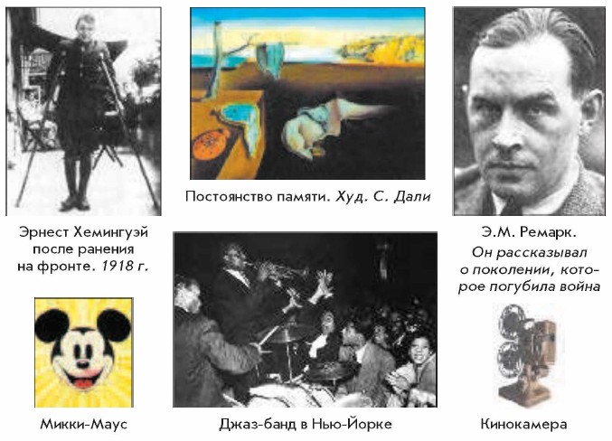 Во всех развитых странах Запада конкуренция заставляла частные фирмы переходить с паровых двигателей на электродвигатели, заменять ручные операции работой на механизированных станках. Введение единого стандарта деталей позволяло на подвижных лентах конвейеров быстро собирать дешевую массовую продукцию. На полях Европы и Северной Америки фермеры пахали на тракторах, собирали урожай на комбайнах, свозили его в амбары на грузовиках. Биологи объяснили генетические механизмы наследственности, что позволило выводить более продуктивные сорта растений и породы скота. На дорогах автомобили пришли на смену конным экипажам. Во многих домах появились технические новинки — холодильники, стиральные машины, радиоприемники. Достижения в области химии позволили синтезировать пенициллин (антибиотик, спасающий от заражения крови, воспаления легких), получить легкие пластмассы, дешевый алюминий, освоить сварку металлов. В небо поднялись первые пассажирские самолеты. Физики проводили опыты по созданию телевидения, разрабатывали теорию получения огромной энергии в результате расщепления атомного ядра. Патефоны и первые магнитофоны распространяли по миру быстрые ритмы новой джазовой музыки, а звуковое цветное кино — голливудские кинокомедии, детективы и мультфильмы про Микки-Мауса студии Уолта Диснея. Знаменитые художники, такие как Сальвадор Дали и Казимир Малевич, искали новые формы и способы изображения того, что недоступно, например, фотографии, - человеческих мечтаний, снов, глубины переживаний и ощущений. Писатели стремились отразить в своих книгах судьбу человека XX века: от влекомого потоком жизни у Эриха Ремарка до пытающегося противостоять обстоятельствам у Эрнеста Хемингуэя.