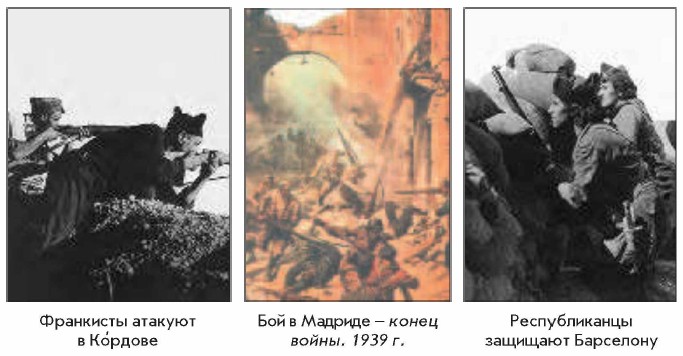 В 1936 году в соседней Испании блок коммунистов, социалистов и республиканцев (либералов) победил на выборах фашистские силы. Через несколько месяцев генерал Франко поднял мятеж, и началась гражданская война в Испании (1936—1939 гг.). Гитлер отправил на помощь испанским фашистам немецкие боевые самолеты, Муссолини — боевые корабли и 150 тыс. итальянских фашистов-«добровольцев». С другой стороны, для борьбы с фашизмом из разных стран в Испанию устремились люди демократических, социалистических и коммунистических взглядов. Интернациональные бригады французов, немцев, американцев, русских вместе с войсками республиканского правительства вступили в бой с фашистами. Корабли СССР доставляли испанским республиканцам самолеты, танки, оружие. В небе над Испанией против немецких асов сражались советские летчики. Однако правительства Англии и Франции объявили, что не будут вмешиваться во внутренние дела Испании. В 1938 году по требованию Лиги Наций интернациональные бригады покинули Испанию. Вскоре антифашистский блок распался, Франко одержал победу.