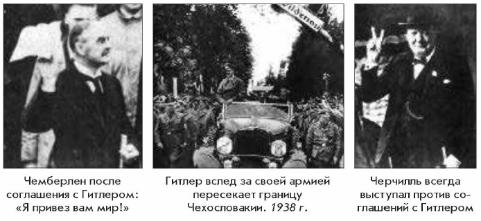 Тогда же, в марте 1938 года, по приказу Гитлера немецкие войска вошли в Австрию. Лидеры страны были арестованы, а на организованном нацистами народном голосовании большинство австрийцев высказалось за аншлюс — объединение двух стран, говорящих по-немецки, в Третий рейх. Вскоре немецкие войска расположились вдоль границ Чехословакии, и Гитлер потребовал, чтобы рейху были переданы приграничные территории, где жило много немцев. Чехословаки мобилизовали свою хорошо вооруженную армию. В случае войны по договору их должны были поддержать СССР и Франция. Однако новые лидеры Франции и Англии хотели всеми силами избежать войны. Резко против гитлеровских планов выступали только левые партии, а в Англии также группа консерваторов во главе с Уинстоном Черчиллем. В сентябре 1938 года в Мюнхене начались переговоры Гитлера с премьерами Англии и Франции — Н. Чемберленом и Деладье при посредничестве Муссолини. Гитлер обещал в случае удовлетворения его требований не расширять агрессии против западных демократий. В итоге Германия, Италия, Англия и Франция предъявили совместный ультиматум Чехословакии — отдать приграничные земли. Правительство СССР было готово оказать помощь Чехословакии, но два государства разделяла территория Польши, правящие круги которой не соглашались пропустить Красную армию через свою территорию. К тому же правительство Чехословакии опасалось, что советские войска помогут местным коммунистам установить свою диктатуру. Приняв условия Мюнхенского соглашения, чехословацкое правительство без боя открыло границы немецкой армии и отдало 1/5 своей территории.